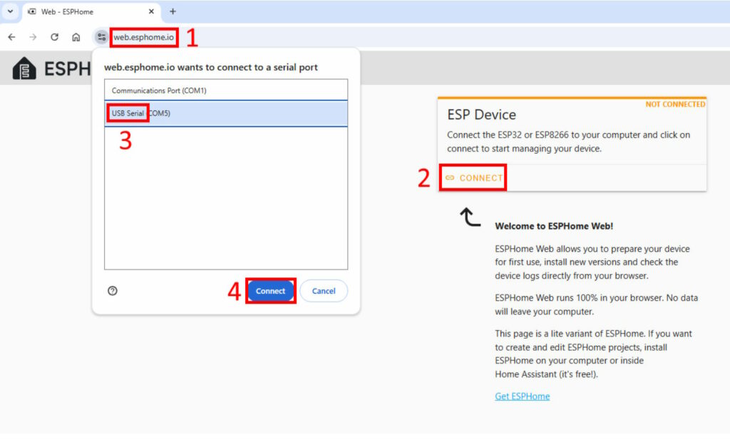 - An der Lëscht vun den seriellen Schnëttstellen “USB Serial (COM X)” auswielen