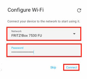 - De Wifi auswiele, an dann d’Passwuert aginn, a wéider mam Knäppchen “Connect“