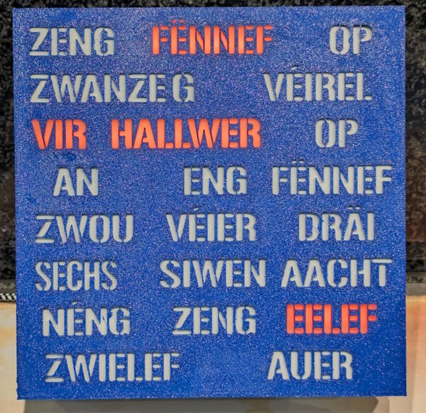 Lëtzebuergesch Wordclock. Weist Zäit anhand vun beliichten LED un. Faarf kann manuell oder automatesch gewiesselt ginn.