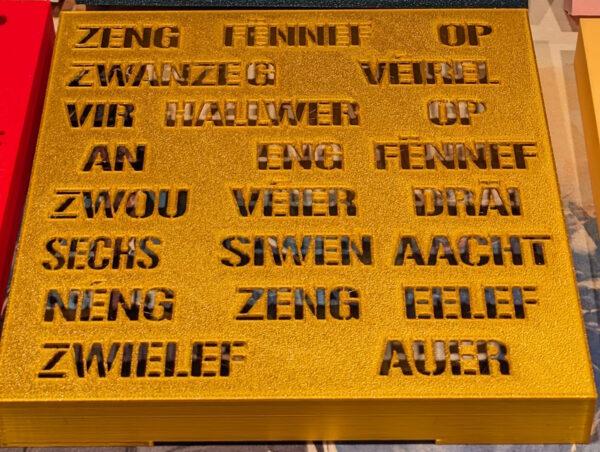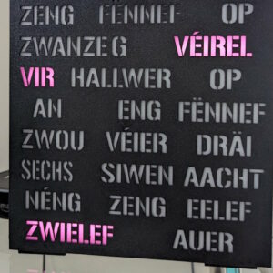 Lëtzebuergesch Wordclock. Weist Zäit anhand vun beliichten LED un. Faarf kann manuell oder automatesch gewiesselt ginn.