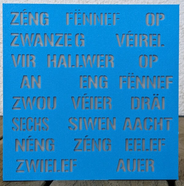 Lëtzebuergesch Wordclock. Weist Zäit anhand vun beliichten LED un. Faarf kann manuell oder automatesch gewiesselt ginn.