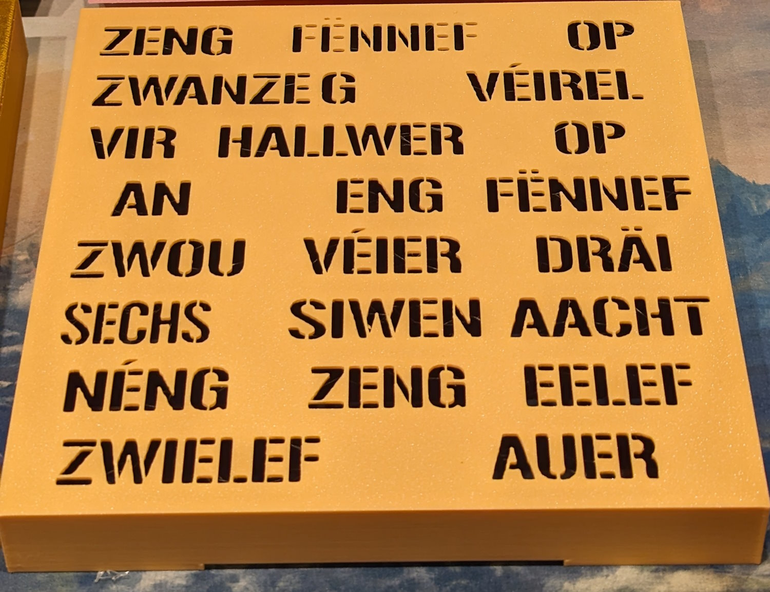 Lëtzebuergesch Wordclock. Weist Zäit anhand vun beliichten LED un. Faarf kann manuell oder automatesch gewiesselt ginn.