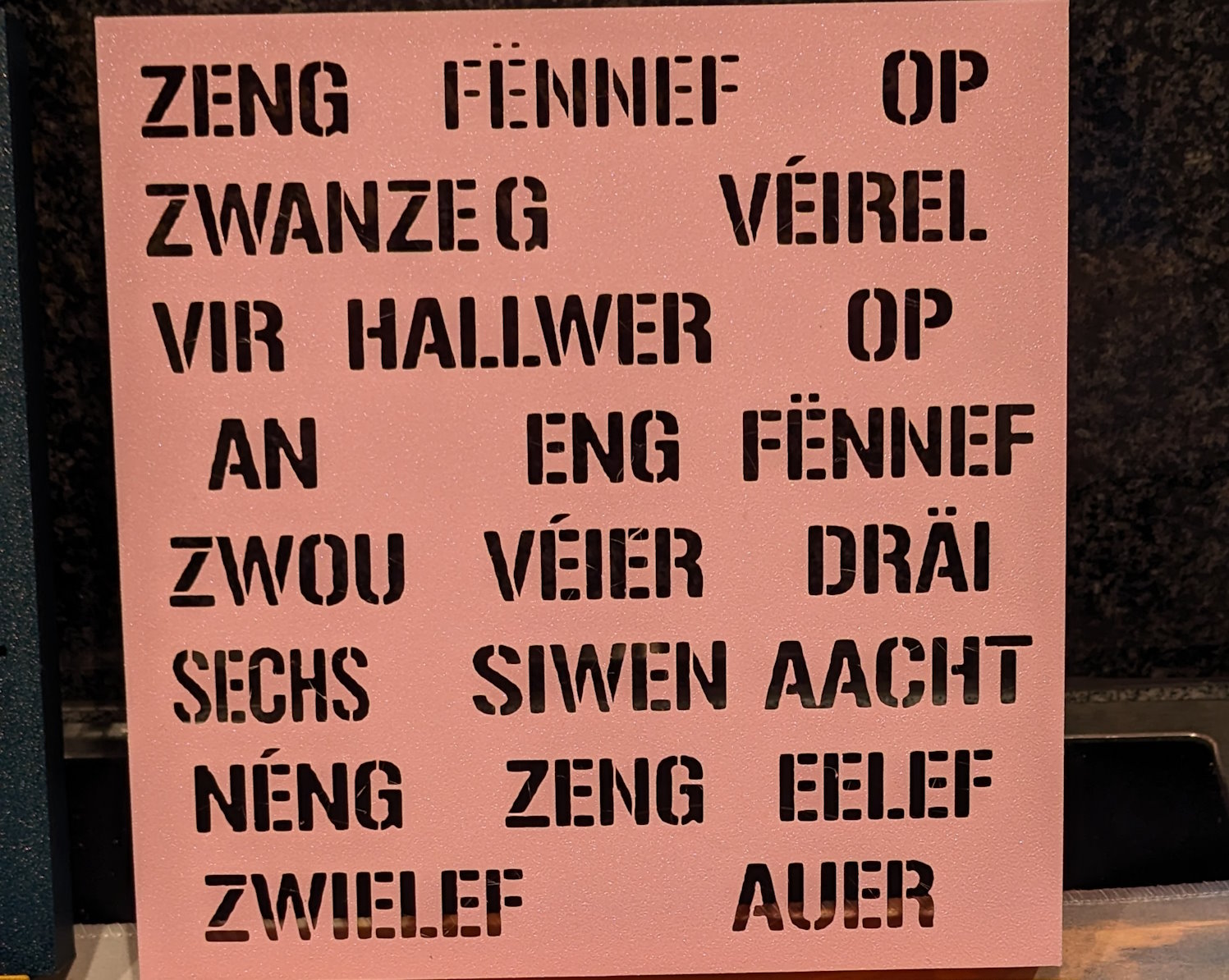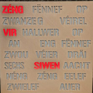Lëtzebuergesch Wordclock. Weist Zäit anhand vun beliichten LED un. Faarf kann manuell oder automatesch gewiesselt ginn.