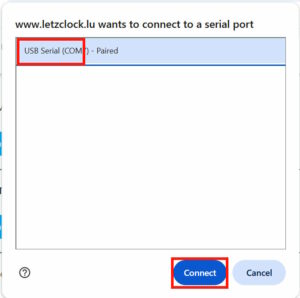 - An der Lëscht vun den seriellen Schnëttstellen “USB Serial (COM X)” auswiele.