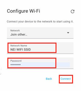 - Dann nach déi nei Wifi Verbindungs Informatiounen uginn an op “Connect” klicke.
